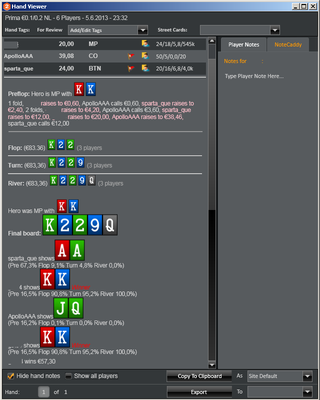 toto je export z herne, lebo HEM2 to zatial netrackuje :( ten uvodny raise je rozdiel oproti BB, cize je to minraise na 2.00EUR ale nebudem to prepisovat.