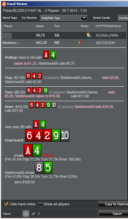 Hand #2 Prima, €0.25/€0.50 No Limit Hold'em Cash, 2 Players