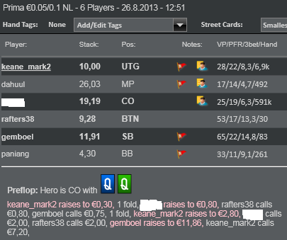Preflop: Hero is SB with Q A Hero raises to €1, BB raises to €4.50, Hero calls €3.50 zahram si silnejsiu ruku v pozicii. nemam read na supera, ako casto a co 3betuje.