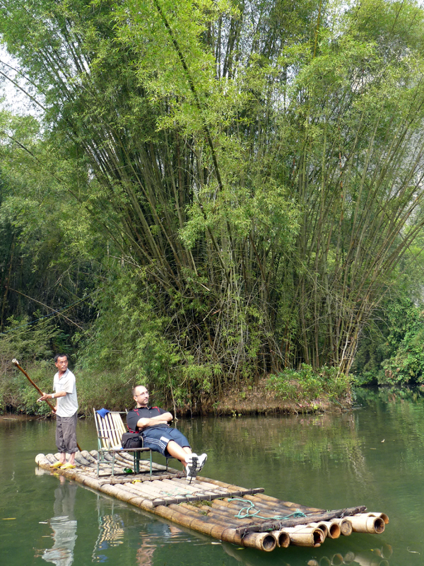 Prvý deň bol na pláne splav rieky Li na bambusových raftoch, pred hotelom sme mali pripravené horské bajky a sprievodcu na mopede, ktorý nás zaviedol do prístaviska a dohodol nám plte. Splav trval niekoľko hodín, bol to super odpočinkový zážitok, pltníci po chvíli ožili a srandovali s nami, cestou sme im i sebe kúpili pivo od predajcov na rieke. Super výhľady naokolo, sem tam schod na rieke, nenudili sme sa, nechali nás aj chvíľu ťahať a rozhodne to nie je jednoduché. Bol to aspoň pre mňa jeden z najpríjemnejších zážitkov celej cesty – čínsky vidiek pôsobí veľmi upokojujúco, človek má problém sa prestať spokojne usmievať ( ale prečo by vlastne chcel prestať