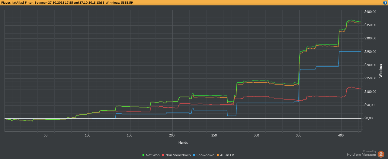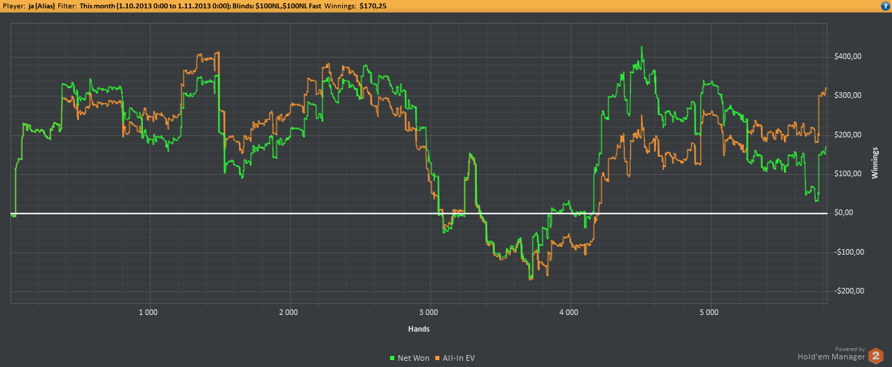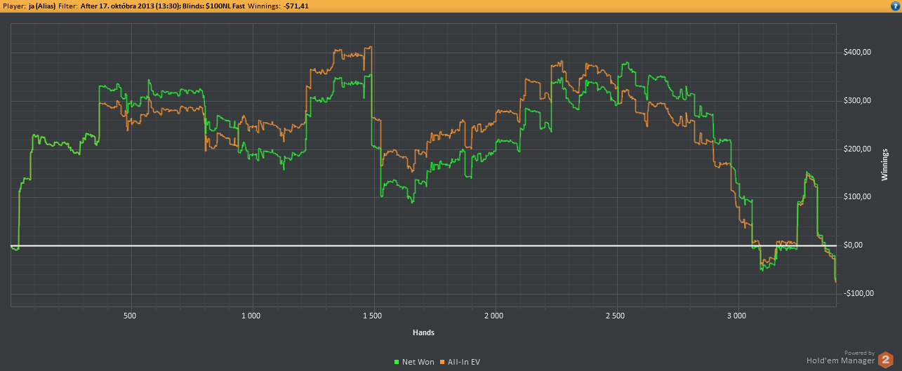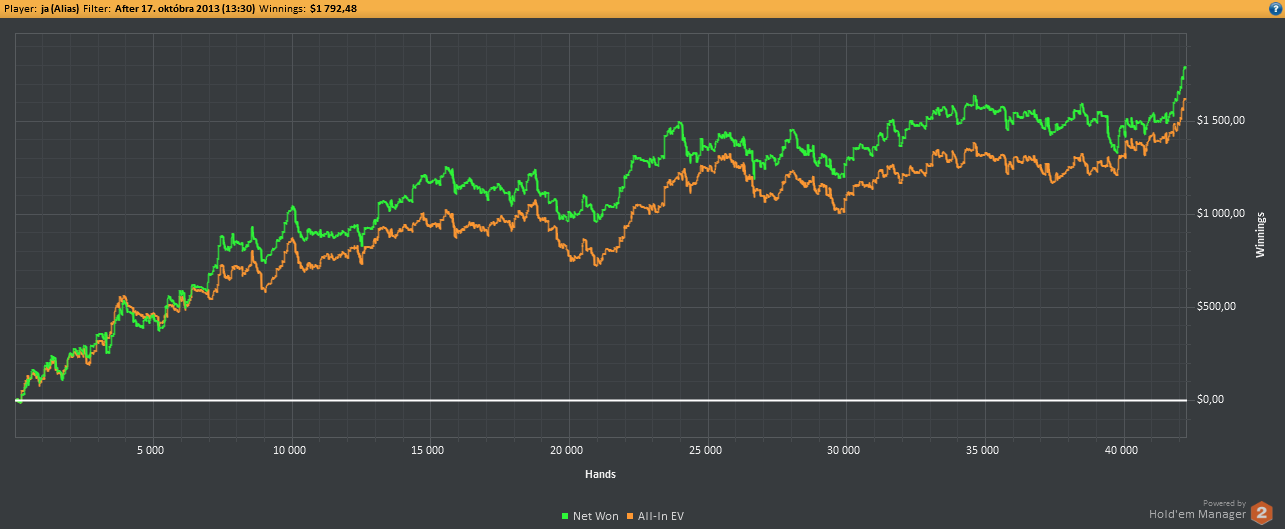celkovo to je len cca 3BB/100, za poslednych 30k hand to je cca 10BB/100 :) som si po tom swingu z uvodu mesiaca zaplatil clenstvo na jednom vyukovom portali, viac zacal analyzovat handy a vyzera to tak, ze sa vysledky pomaly dostavuju :)