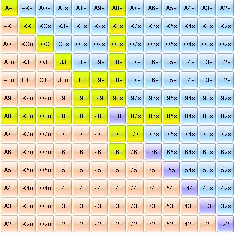 kvoli moznym straight drawom sa to snazim dostat co najrychlejsie tam, co je snad chyba, pokial ma v range vsetky 8x, straight draws a overpairy okrem AA, KK, tak som maly favorit, cize to tam musim dat