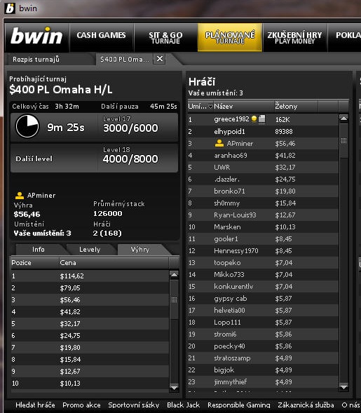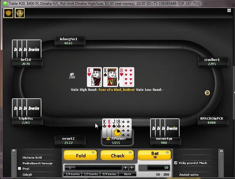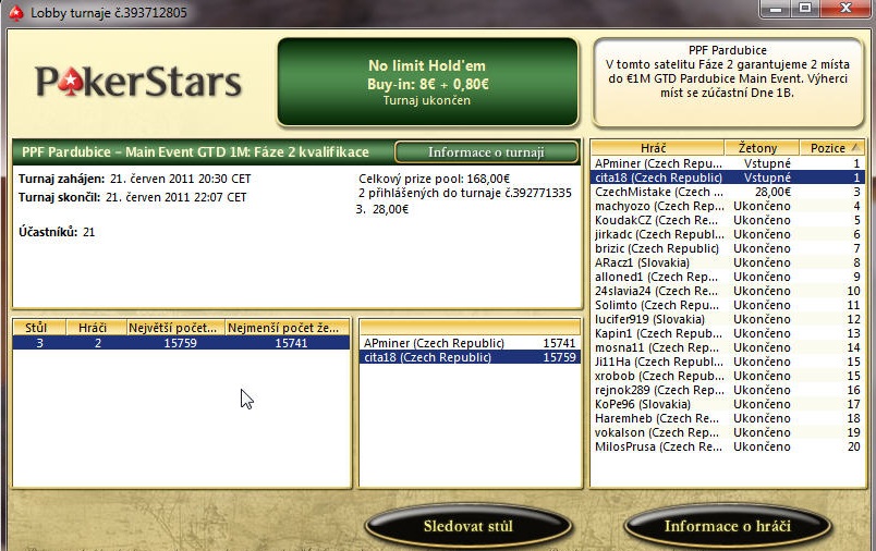 NEVER s buy-in nad 1000 Kc .... AKo raise = blindy doma, AJ raise = blindy doma, J9raise = blindy doma, AJs reraise = sebrany pot PF, double - z BTN raise, ja na BB najdu JJ a push, dostanu call a proti 22 ustojim ..... jinak nejcastejsi handy 94, 73, 62 ...