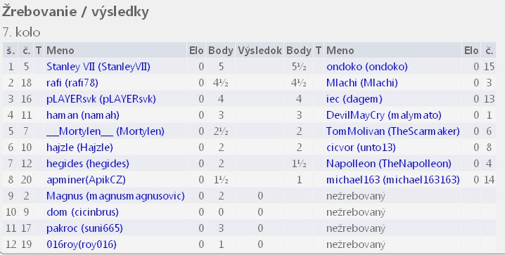 7.kolo sa odohrá v nedeľu o 18:30 (samozrejme dúfam a predpokladám, že väčšina hráčov bude kontaktovať súpera a kolo odohrajú skôr). Tento termín je stanovený len ako posledná možnosť, podľa ktorej sa bude kontumovať. Ak partia nebude do tohoto termínu odohraná, alebo dohodnutá remíza, pozrieme sa kto je o 18:30 v nedeľu nalogovaný na chess.com a ten dostane bod. Ak nebude nalogovaný ani jeden, partia bude kontumovaná 0:0.