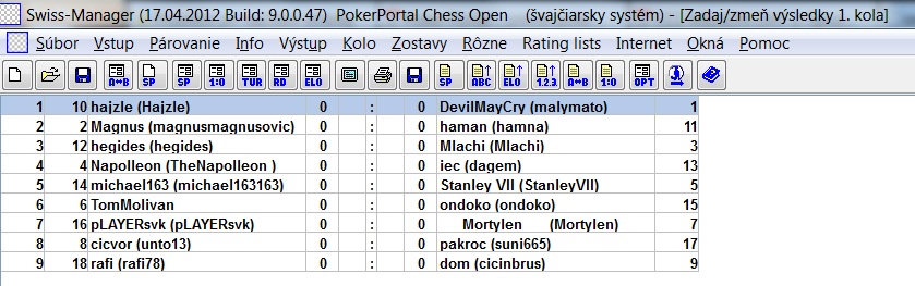 Už máme nicky od všetkých, okrem TomMolivana, ale je nás bez neho nepár, takže bude vo vyžrebovaní a môže si ešte nick doplniť, ak nie, tak bude výhra kontumačná (ak je teraz niekde mimo a nemôže čítať fórum), ale to je jedno, lebo aj tak by jeden musel vyhrať kontumačne, lebo je nás nepár. Vylosovanie kôl bude vždy robiť rafi, má na to soft. Pre tých, ktorí sú vo svete turnajového šachu noví, prvý vo vylosovanej dvojici má vždy biele figúrky