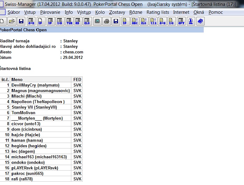 Na losovanie pouzivam oficialny program slovenskeho sachoveho zvazu (aj inych narodnych federacii) Swiss Manager 9.0.0.47.