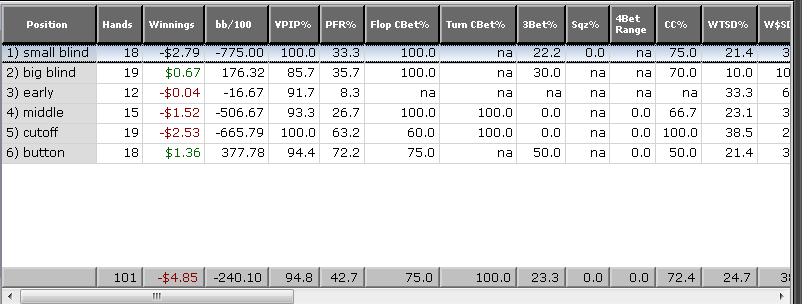 Zabudol som stats PLo 95/44/3b 43 po 57 rukách a NLHE 94/39/ 3b 15 po 66 rukách