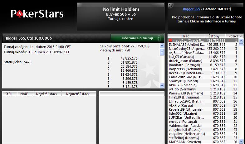 Nedeľňajšia online noc sa niesla v duchu skvelého výledku trojice českých hráčov "GooD4nthin", "LukJ3" a "6MIKI4" a ich účasti na finálovom stole turnaja P****Stars $11 Sunday Storm. Turnaja sa zúčastnilo 42,957 hráčov. Prizzepole sa tak vyšplhal na $429,570. Ako prvý sa z trojice českých hráčov rozlúčil s finálovým stolom "LukJ3" , ktorý si za ôsme miesto odniesol $2,491. O dve priečky lepší výsledok zaznamenal "6MIKI4", keď si za šieste miesto prilepšil o $5,219. Najdlhšie sa v turnaji udržal "GooD4nthin". Ten si v posledných troch hráčoch vydupal neskutočný deal, keď presvedčil chipleadera so stackom 120K žetónov, aby traja splitli rovným dielom. (rozloženie žetónov 40K,60K,120K) To v tej chvíli predstavovalo približne $24,000. Hráči súhlasili a dohrávalo sa o $6,000. Nakoniec bol tým šťastným práve český hráč "GooD4nthin" a po...