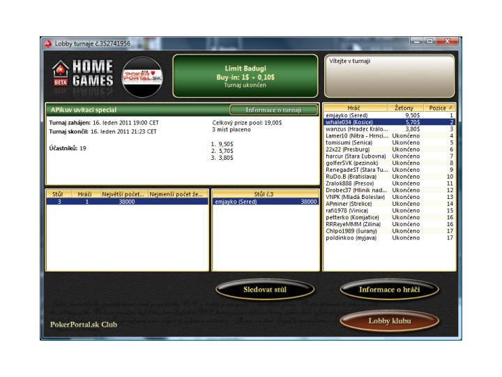 tomisumi napísal:Víťazom "otváracieho ceremoniálu" nášho klubu sa stal (chvíľa napätia) emjayko! V konkurencii 19 hráčov ktorí sa prišli popasovať s nezmyslom "Badugi" absolútne kraľoval na final table a o chiplead prišiel iba nachvílu v heads-up.