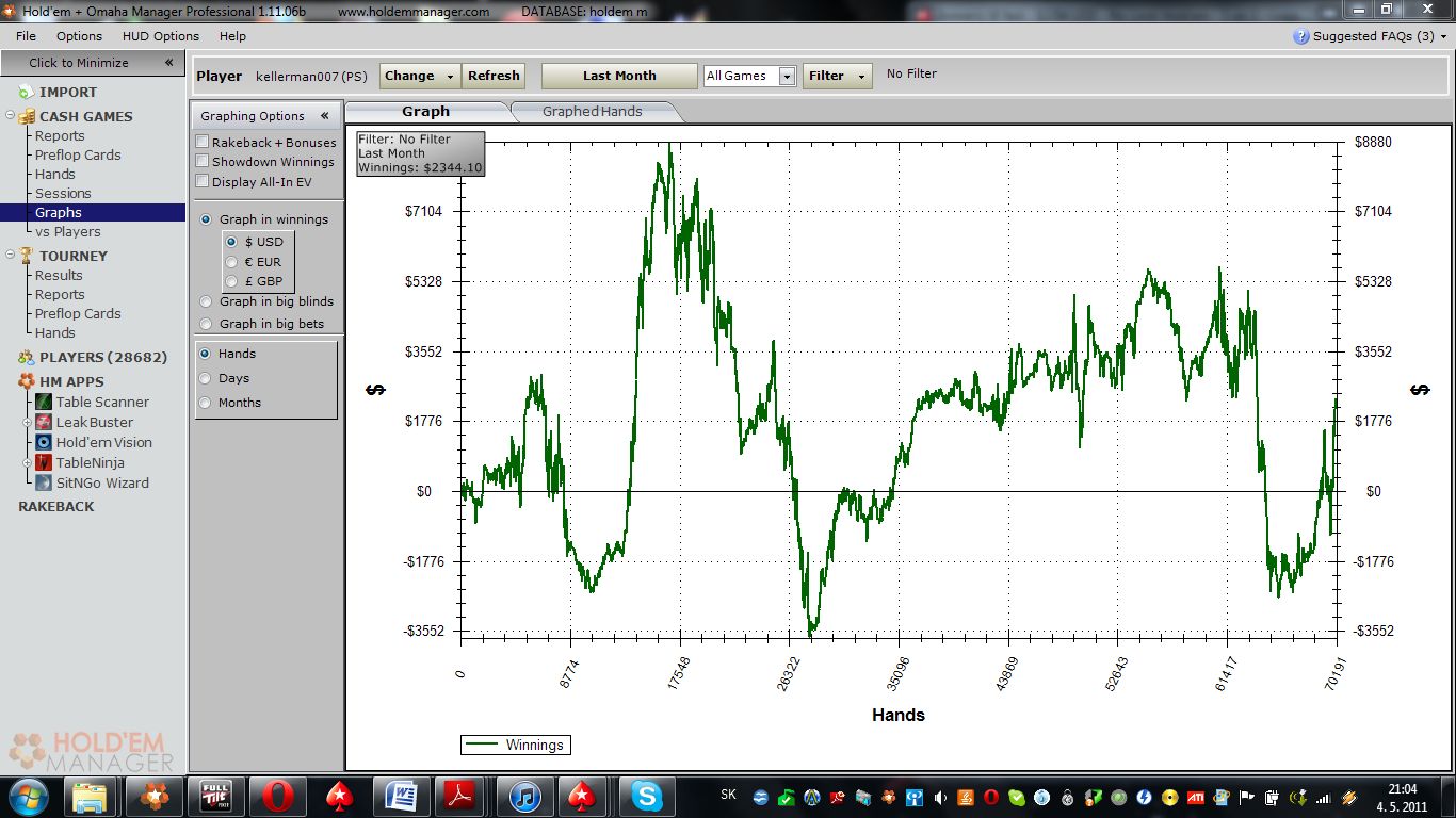 Rekapitulacia mesiaca. April bol klasicky breakeven month, v znameni grind, grind, grind, tilt -5k day, grind, grind, grind, tilt -4k... whatever, ked hram A game tak som velmi tough hrac, no akonahle na mna pride tilt tak sa premenim v spewy opicu. Znak dobreho hraca je ze tiltuje co najmenej a hra A game co najcastejsie, takze natom treba popracovat aj ked fakt neviem, ze co by mi mohlo pomoct v tomto ohlade. Asi si skusim dat na maj stoplosslimit 2k na session aj ked sa poznam a pravdepodobne to opat nedodrzim... :wall: Paradoxne je, ze po black friday sa mi zda ze je o cosi vacsi traffic na 400nl v podobe ruskych ryb :) co je pekne, ale mrzi ma zas, ze so mnou uz nechcu hravat ziadni regulari :@ tak z nudy hravam aj mttcka v nedelu, mal som par deep runov, naposledy na sunday 500 v nedelu, bohuzial som si nabehol dvakrat po sebe do AA s KQ proti 10bb reshovu a s KK ked som 30bb deep reshovol middle position open, skoda toho, lebo by som potreboval nejaky bankroll boost :( (nejaky zaujemcovia na stakenutie? :D). V maji dam asi o dost mensi objem, pretoze sa blizi skuskove a je hokej :apminer:, takze tak :gl: