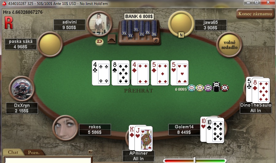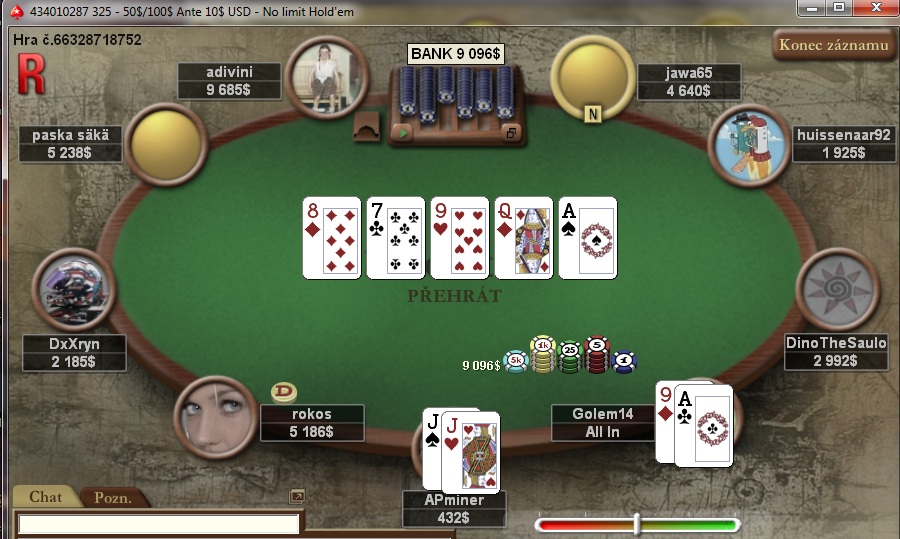 ... rus 300, ja 755 on call ... na flopu check, ja bet nad 1/2potu, on AI a ja jisty, z jsu lepsi jak Ax call ... = klasika
