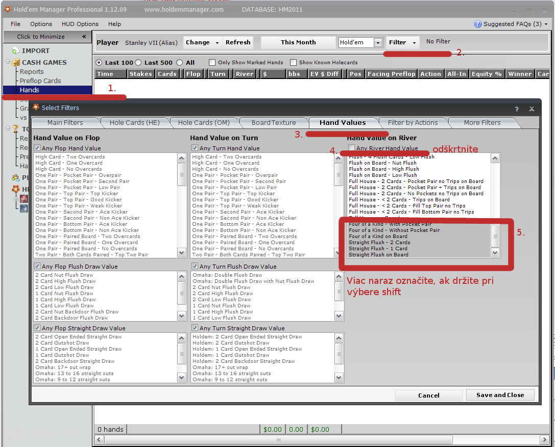 Treba si nastaviť alias, do ktorého pridáte všetky svoje nicky z rôznych herní, kde ste hrali a potom ísť podľa postupu na obrázku nižšie a zapnúť si filtre na ruku na showdowne na poker a lepšiu. Ak tam nakoniec žiadnu neuvidíte, môžete ísť vo filtri smerom vyššie a pridať aj ruky s fullhousami.