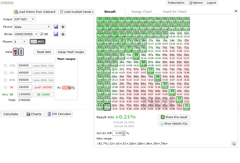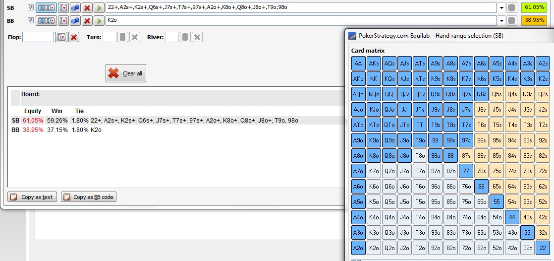 pLAYERsvk napísal:K2 je zahrate spravne ak protihrac pushuje (raise/calluje viac ako 41% ruk. resp. ak zahodi s 5bb stackom zo smallblindu menej ako 60% ruk.)