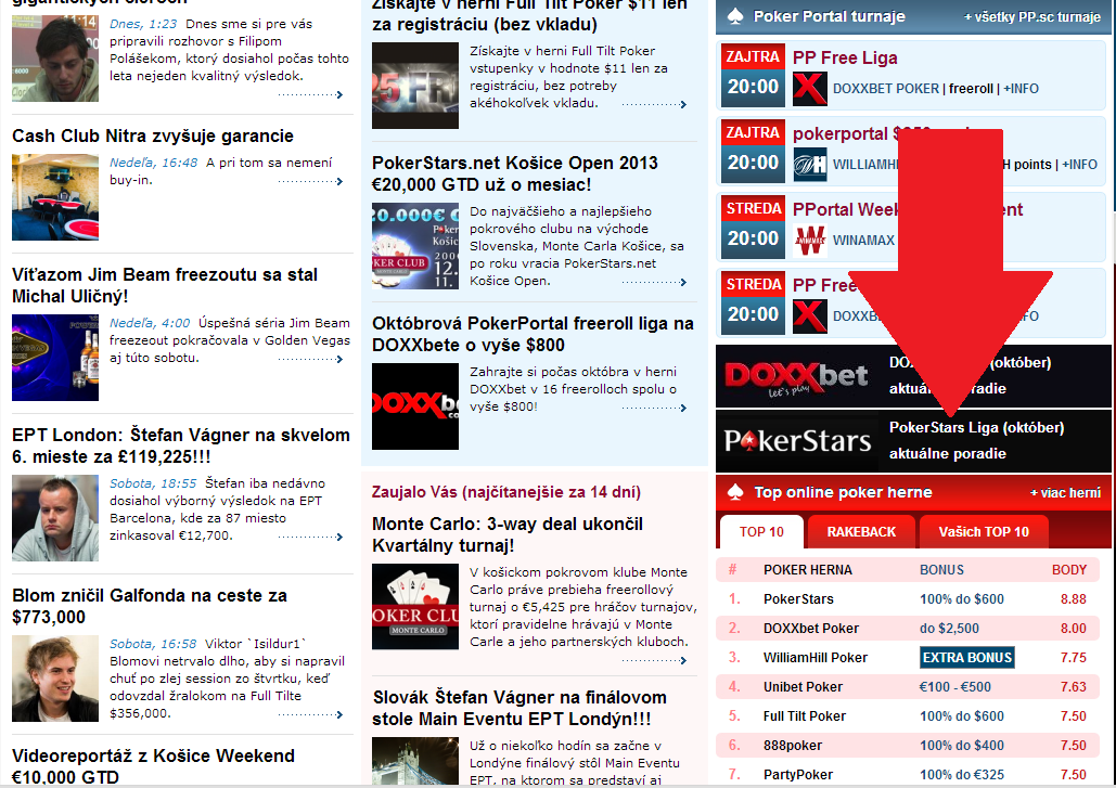 Aj počas októbra si môžete v herni P****Stars zahrať PokerPortal freerolly. Pondelkové freerolly s ligovou tabuľkou Pondelkové freerolly o $100 sú určené len pre hráčov, ktorí sa v herni P****Stars zaregistrovali po príchode na stránku tejto herne cez odkaz na PokerPortal.sc. Vstup do všetkých pondelkových freerollov s výnimkou posledného turnaja v mesiaci majú títo hráči zdarma.