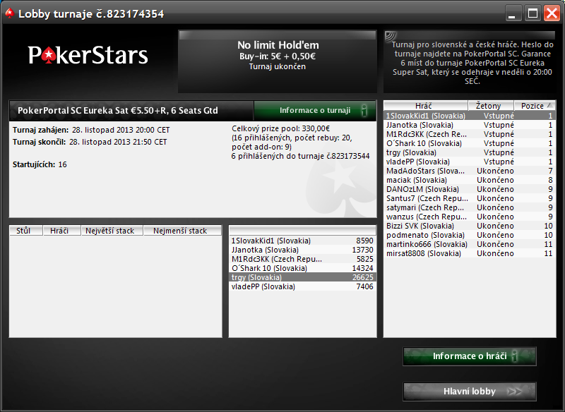Zatiaľ je registrovaných len 6 hráčov, tí, ktorí ste vyhrali vstupenky počas týždňa sa nezabudnite regnúť a ak sa chce pridať niekto ďalší, dvere sú samozrejme otvorené, heslo je tu: http://www.pokerportal.info/online-turnaj ... a-turnaje/