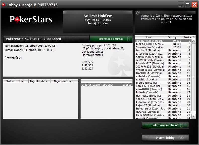 11.8.2014 o 20:00 - PokerPortal SC $1.10+R, $100 Added, ID: 945739713