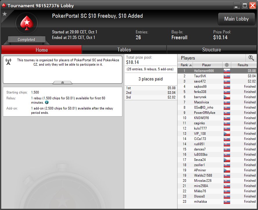 Prvý októbrový freeroll hralo len 26 hráčov - veľmi dobrá šanca získať pár dolárov pre svoj bankroll zdarma a Hellement666, TaurSVK a Saxo472 ju aj využili. :)