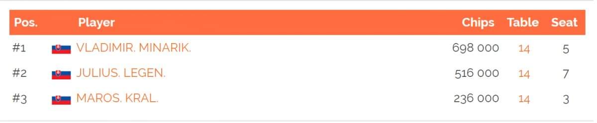Úvodný deň priniesol 29 vstupov a v hre nechýbali známe mená, ktoré chceli mať postup vo vačku už hneď na začiatku. Pri postupovej matematike 10% percent do nedeľného finále sa mohli pozrieť len najlepší traja hráči , ktorí prešli k radostnému „bagovaniu“ a na čele postupujúcich sa umiestnil Vladimír Minárik. Podarí sa v dnešnom flighte 1B niekomu pokoriť úspech chipleadera?