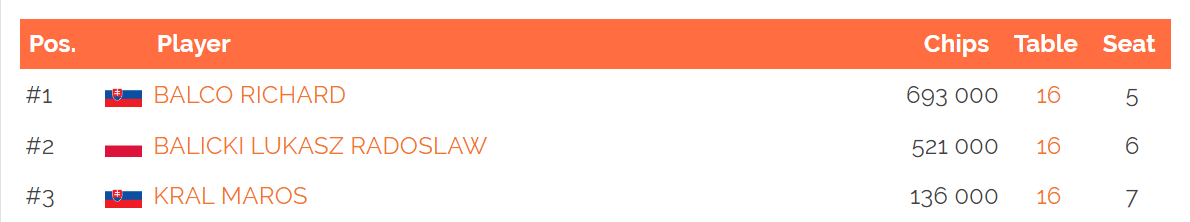 Po dvoch úvodných dňoch 1A a 1B bolo zaznamenaných celkovo 49 entries a do garancie chýba ešte viac ako 62,000€. Spomedzi 5 finalistov ma najlepšiu východiskovú pozíciu Richard Balco s takmer 700K žetónov.