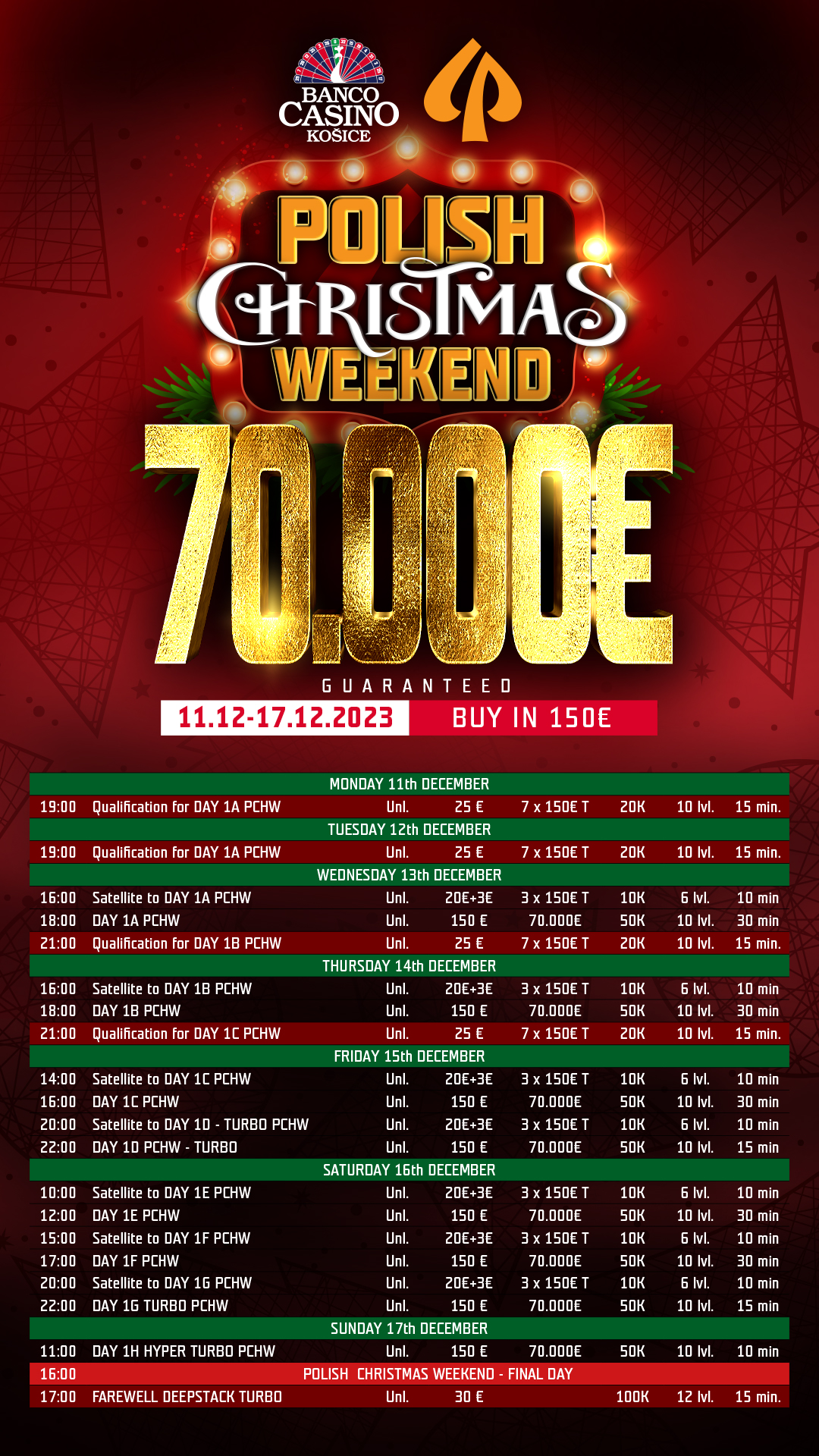 POLISH CHRISTMAS WEEKEND 70.000€ GTD pokračuje. Kompletný program máte možnosť pozrieť si na webovej stránke Banco Casino Košice:(1).jpg)