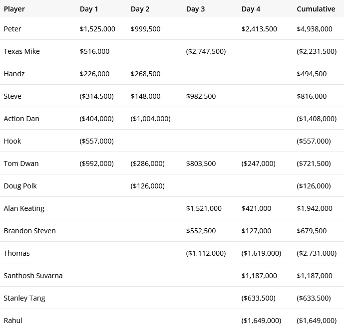 Po štvordňovom maratóne bude najlepšie spávať "Peter", ktorý absolútne zdemoloval konkurenciu a skončil v pluse skoro $5 miliónov. Na druhej strane, jeho správanie za pokrovým stolom mu veľa fanúšikov neprenieslo, keď spravil hit and run počas prvej session a odišiel v pluse milión. V záverečnej session zbalil kufre tiež predčasne, keď prehral pot $1.6 milióna proti Alanovi Keatingovi a za krátko sa pobral preč s plusom $2,413,500, čo pobúrilo aj pokrovú verejnosť.