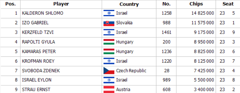 Včerajší finálový deň SPO Main Eventu odštartoval so 16-timi účastníkmi, ktorí bojovali o titul šampióna a s ním spojenou odmenou 60.530€. Netrvalo dlho a sformoval sa finálový stôl s deviatimi hráčmi a na jeho začiatku chipleaderskú pozíciu hájil Shlomo Kalderon z Izraela
