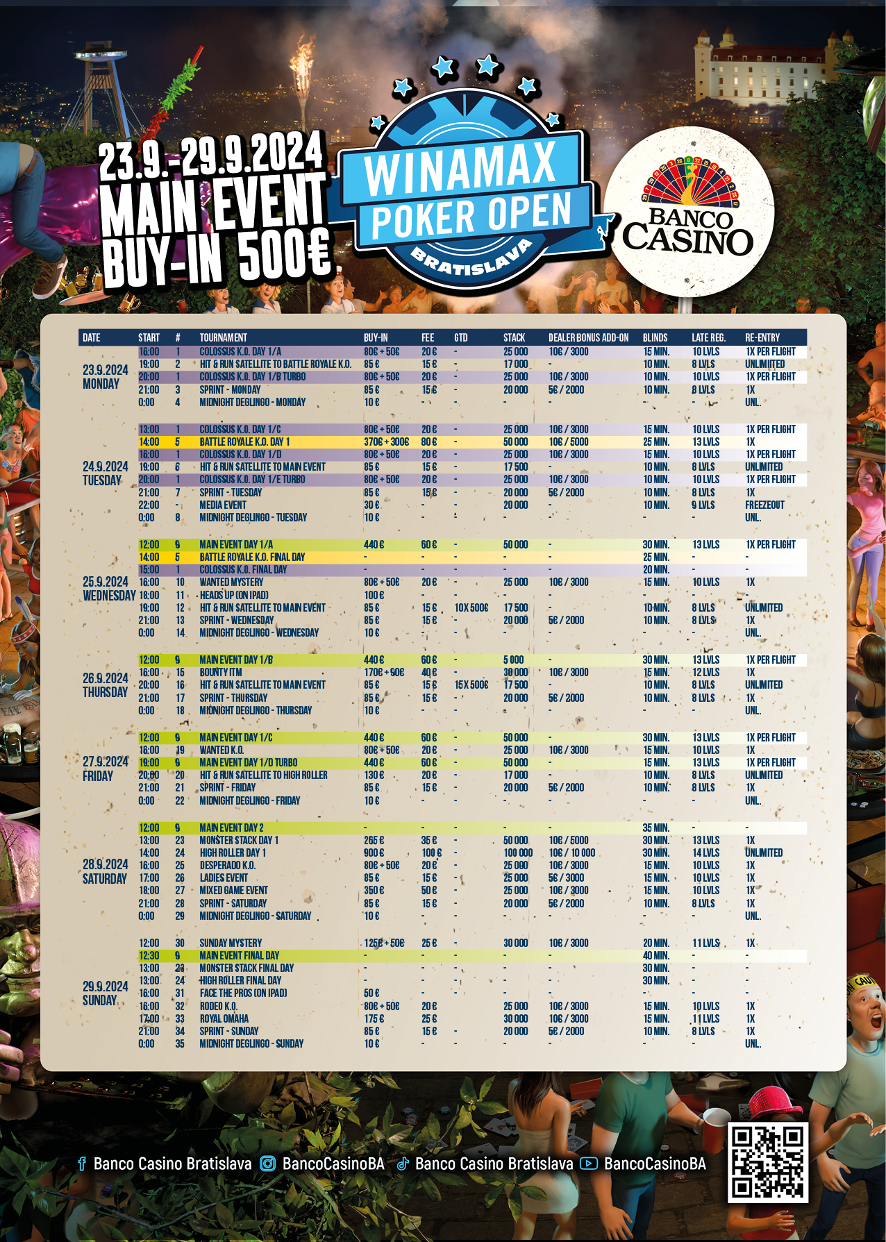 Samozrejme najväčší „hype“ má Main Event WPO, v ktorom sa očakáva prizepool cez 1.000.000€ v Main Evente Winamax Poker Open? Najprestížnejší titul WPO Main Event Bratislava Champion je voľný a zapojiť sa môžete od zajtra za 500€ vstupné. Podarí sa Martinovi Bartošovi obhájiť titul? Vieme, že konkurencia bude náročná, keďže do Banco Casino príde aj celý PRO TEAM Winamaxu, v ktorom sú zvučné mená ako Gus Hansen, Andrian „Amadi_17“ Mateos, Mustahpa Kanit, Gaelle Baumann, Romain „rLewis“ Lewis či Davidi Kitai. My však veríme, že titul zostane v rukách pravidelných hráčov Banco Casino!