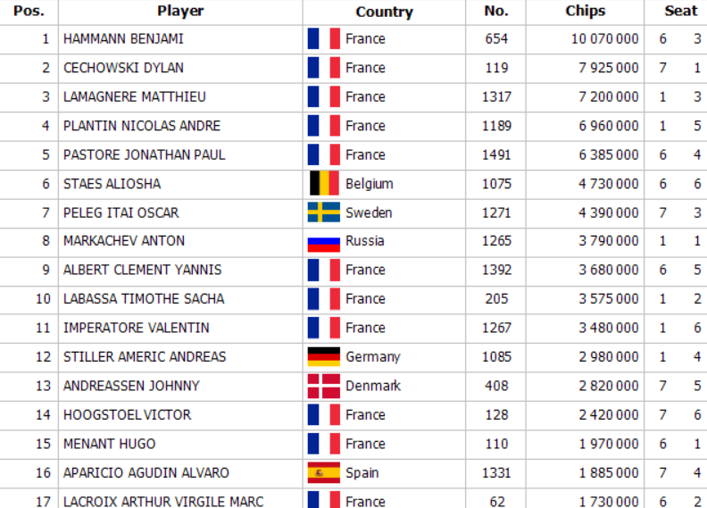 Z úvodných štyroch flightov postúpilo do včerajšieho Day 2 až 252 účastníkov, ktorí mali garantovaný min-cash 1.000€. Samozrejme nikto sa nechcel len uspokojiť s min-cashom a všetci bojovali o účasť v dnešnom finálovom dni. Po niekoľkých hodinách hry sa turnajové hodiny zastavili a v dnešnom finále sa predstaví 17 členné pole, na ktorého začiatku je chipleaderom Benjamin Hammann z Francúzska. Eliminácie Day 2 nájdete na konci článku. Komu sa podarí ukoristiť titul, trofej a 90.000 eurovú odmenu?