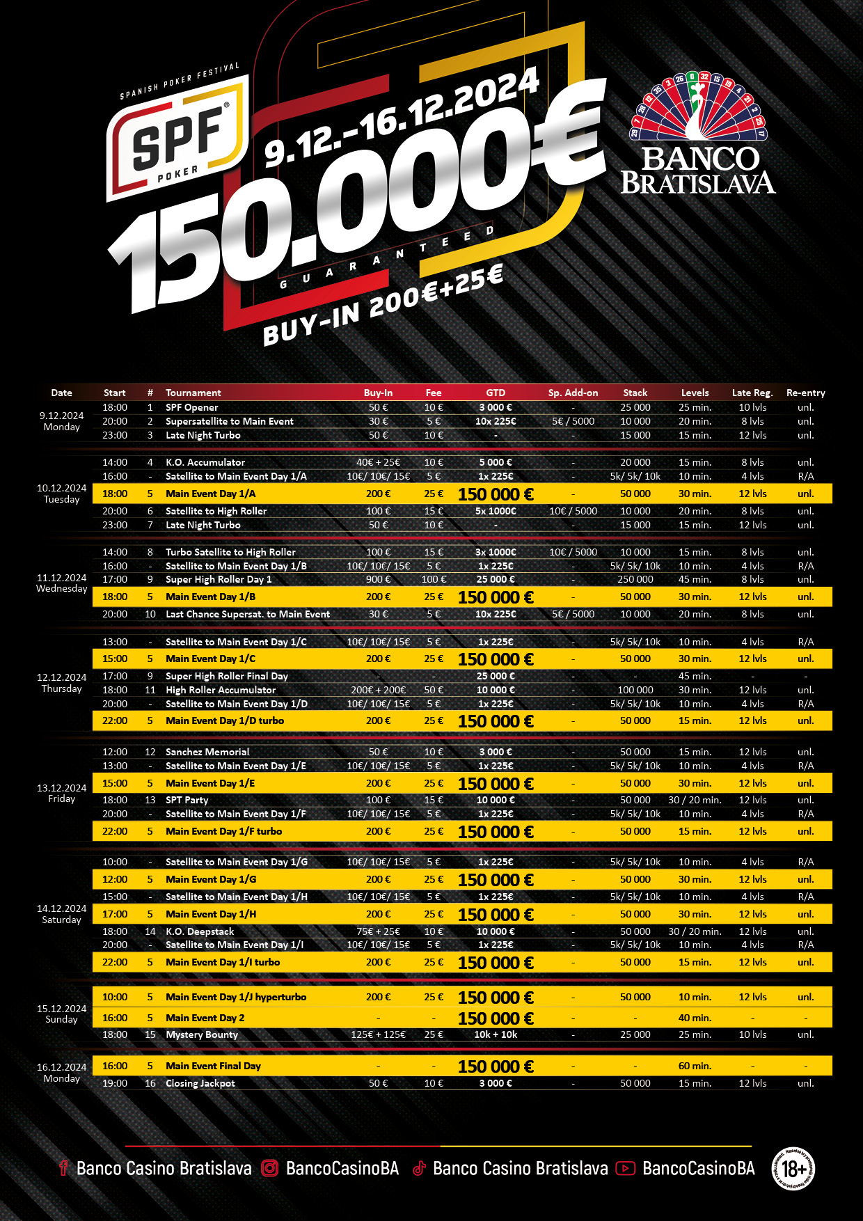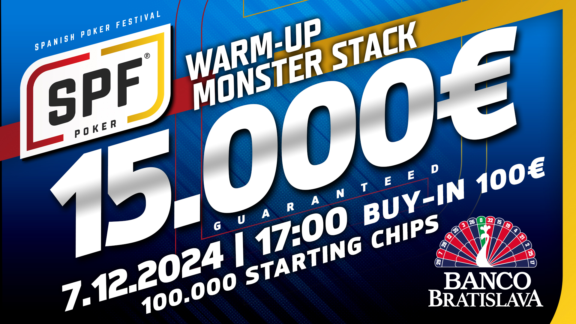 Sobota v Banco bude patriť Warm – Up Monster Stack turnaju k nasledujúcemu Spanish Poker Festivalu a bude mať garanciu 15.000 eur a to len za vstupné 100€, za ktoré účastníci dostanú 100.000 žetónov a až polhodinové levely. Ak vstúpite do turnaja v prvom leveli, tak po zakúpení buy-inu s addonom budete mať až 625 big blindový stack, takže MONSTER STACK turnaj za ľudové vstupné!