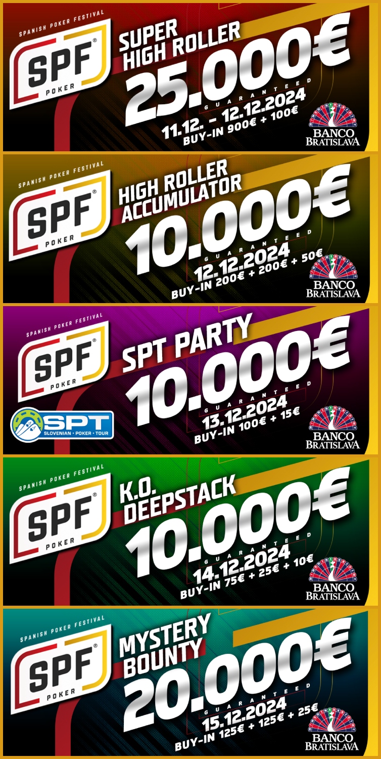 Grand Finále SPF prináša nielen hlavné podujatie, ale aj side eventy, ktoré stoja za to! Už dnes sa rozohrá Super High Roller, ktorý prináša 25.000€ GTD a to za vstupné 900€ + 100€. Až 250.000 štartovných žetónov čaká na štartujúcich a poctivé 45 minútové levely! Samozrejme nebudú chýbať ani ďalšie bomby!