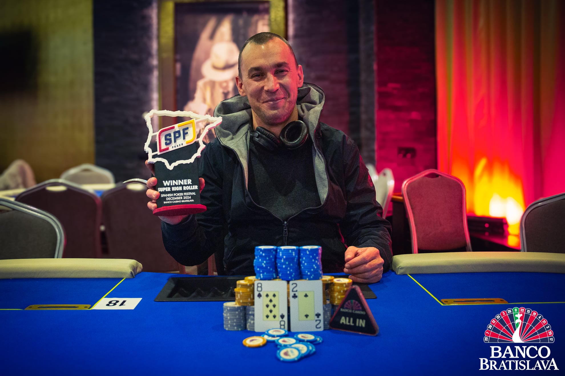 Spanish Poker Festival hostil včera aj finálový deň Super High Rolleru, ktorý zaregistroval 39 účastníkov a tí si vyzbierali 33.345€, o ktoré zabojovala posledná deviatka hráčov. Tá odštartovala súboje od piatej hodiny a po niekoľkých hodinách hry sme spoznali šampióna Attilu Koncz z Maďarska a ten si odniesol plnú výhru 11.595€!