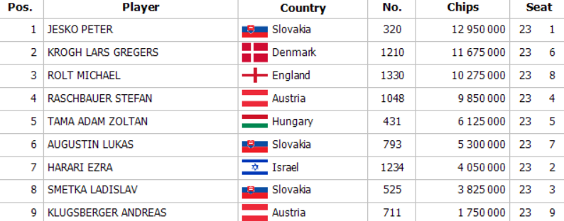 Posledných 16-násť hráčov zasadlo za pokrové dva stoly Championshipu a už len niekoľko eliminácií ich delilo od víťazstva a zisku odmeny až 38.000€. Samozrejme prvým krokom bola eliminácia a presun pod žiaru televíznych reflektorov a drobnohľadu kamier a to sa podarilo týmto deviatim hráčom:
