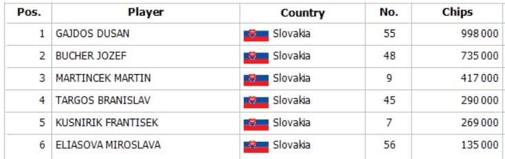 Neskorá registrácia je nastavená na 10 levelov, kedy hráči môžu siahnúť po možnosti re-entry či vstupu do turnaja. Celkovo v prvý deň bolo učinených 57 vstupov a podľa pravidiel turnaja do FINAL DAY musela postúpiť šestica hráčov. Najlepšie spomedzi postupujúcich si počínal Dušan Duško Gajdoš ,ktorý takmer prekročil miliónovú hranicu chipov. Postupujúci zapečatili svoje postupové žetóny, ktoré si rozbalia až v nedeľu o 16:00 hodine.