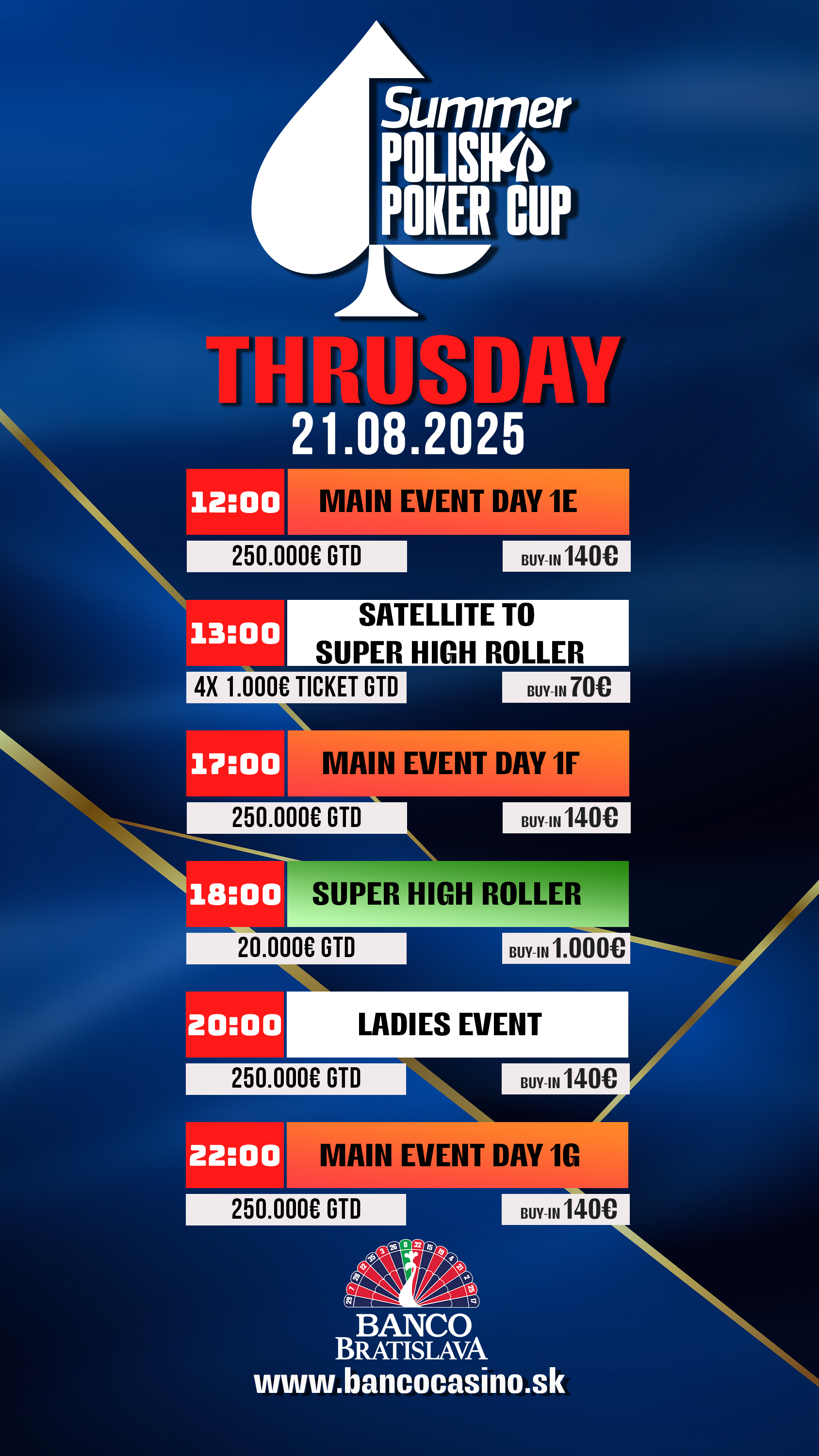 Dnes to bude v Banco vrieť, keďže máme informáciu, že dnes príde do Bratislavy viac ako 400 poľských hráčov a tí zaručene vytvoria skvelú atmosféru a ešte lepšiu akciu. Na programe sú nielen tri možnosti v Main Evente 250.000€ GTD na postup, ale aj Ladies Event spozná svoju šampiónku a spoznáme aj šampióna „ťažkých váh“, keďže sa odohrá aj Super High Roller 20.000€ GTD so vstupným 1.000€!