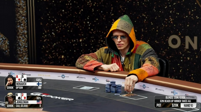 Monarch síce chytil viacero silných kombinácií, dokonca získal veľký pot s dvomi pármi proti top páru Jungleman-a, no Američan odpovedal trpezlivo a presne. Najskôr správne zahodil top pair proti all-inu súpera, následne trafil flush a dokonca Royal Flush, čo vyvolalo u Fína povzdych: „It feels rigged.“ Rozhodujúci moment prišiel pri all-ine na shortstacku Q♥3♥ proti A♦8♥, ktorý definitívne poslal Ketolu z hry.