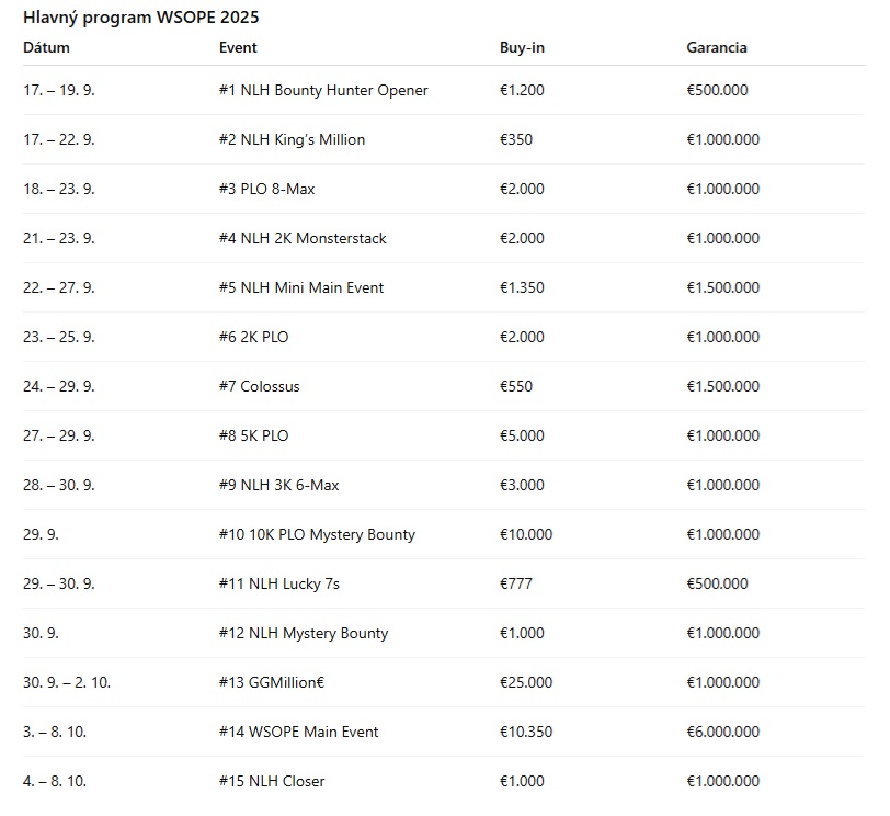 Dnes štartuje v King’s Casino Rozvadov už 17. ročník World Series of Poker Europe (WSOPE), ktorý potrvá do 8. októbra. Festival prinesie 15 náramkových eventov s buy-inmi od €350 až po €25.000 a celkovými garanciami presahujúcimi €20.000.000.