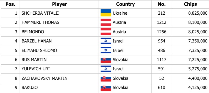 Po troch hodinách hry sa sformoval finálový stôl, na ktorého začiatku chipleadoval Vitalii Shcherba so stackom takmer 9 miliónov žetónov.