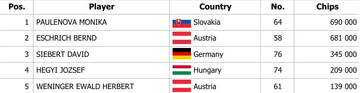 Štvrtok v Banco Bratislava priniesol len 40 entries v Main Evente 100.000€ GTD, čo znamenalo postup iba 5-tich hráčov. Najväčší stack si zabalila domáca hráčka Monika Paulenova!