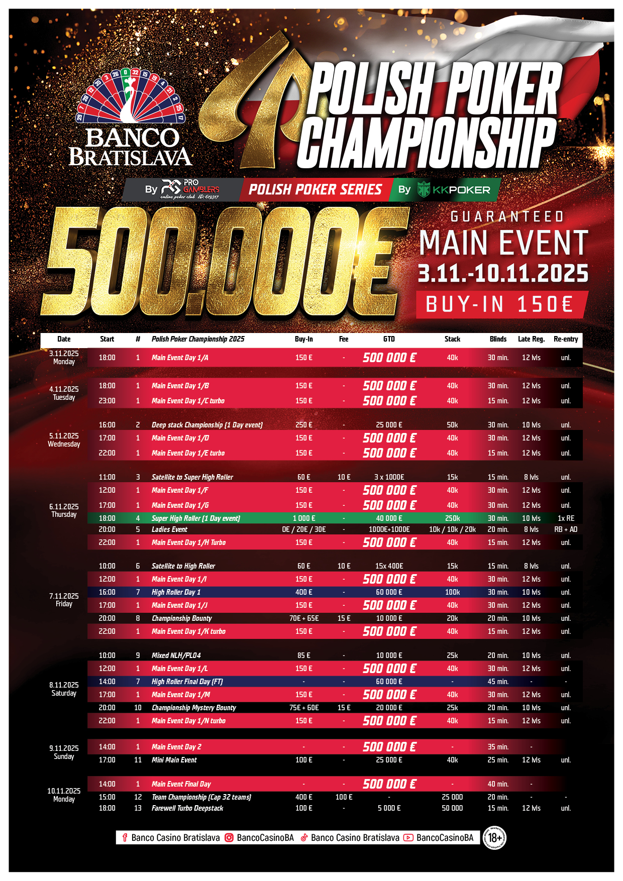 Na základe ohlasov hráčskej komunity, vypredanosti hotelov v okolí Banco Bratislava bude určite Polish Poker Championship 2025 ašpirovať na rekordné podujatie nielen na Slovensku! Preto Banco určite vyzýva hráčov, aby využili už úvodné dni Polish Poker Championshipu, ktorý bude lámať rekordy. Predsa šanca hrať o 500.000€ GTD iba za 150€ sa nerodí každý deň!.jpg)