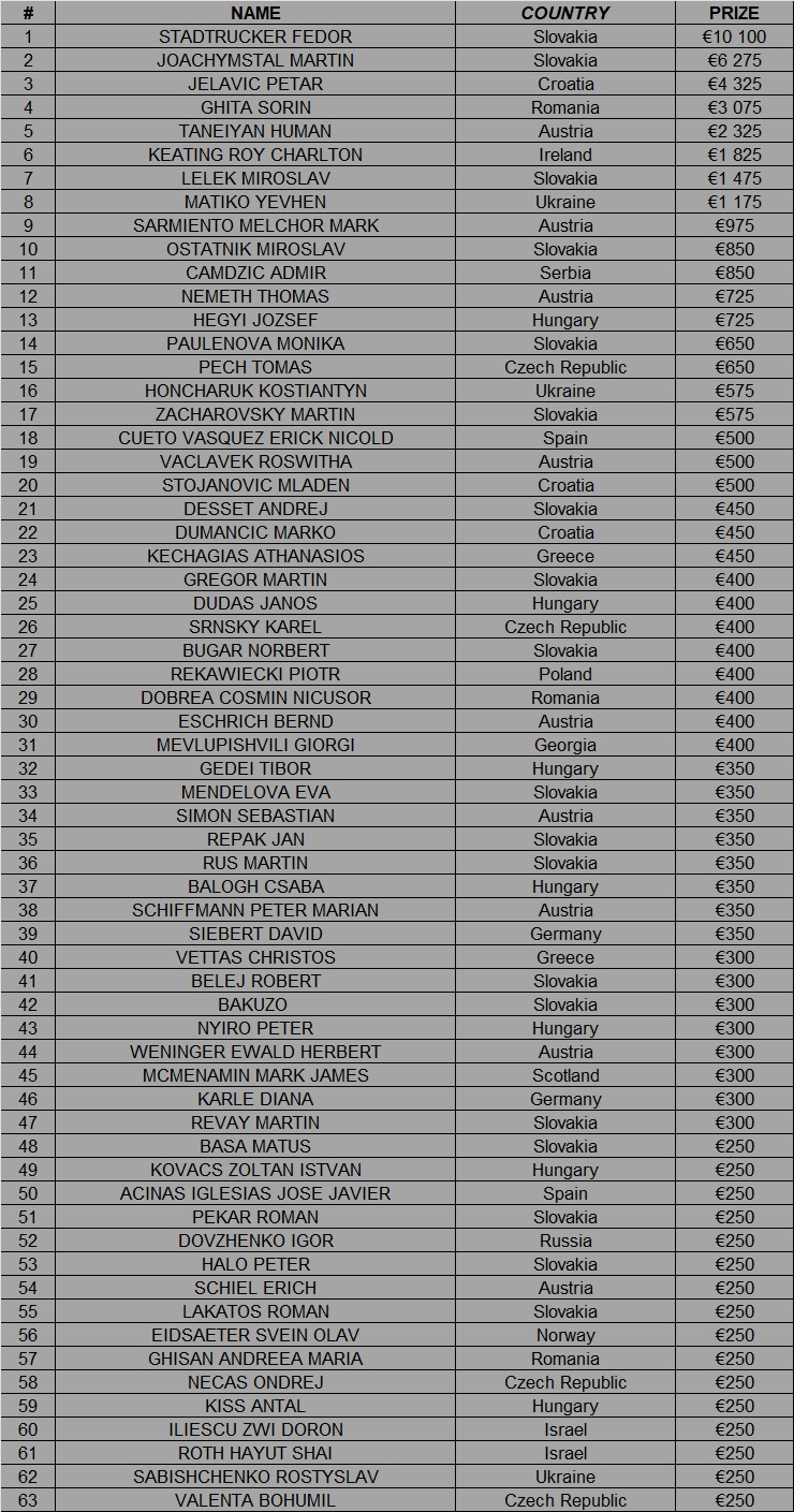 Po niekoľkých hodinách hry sa sformoval finálový stôl, na ktorého začiatku bol chipleaderom Fedor Stadtrucker a ten to dotiahol do víťazného konca, keď v slovenskom heads-upe porazil Martina Joachymstala. Gratulujeme!