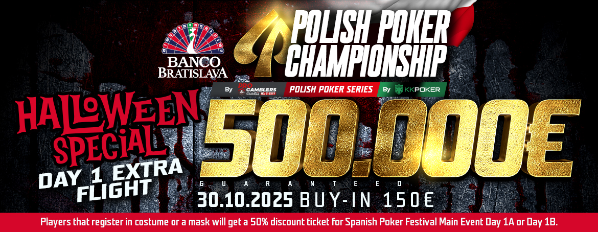 Pre enormný záujem o Polish Poker Championship 500.000€ GTD sa Banco Bratislava rozhodlo pridať EXTRA flight Day 1 a to 30.10.2025 s prívlastkom HALLOWEEN SPECIAL! Môžete sa tešiť na „mrazivú“ atmosféru, už aj pred flopom, keďže Banco staff bude odetý v špeciálnych maskách. Pre hostí si Banco nachystalo brutálnu akciu – ak prídete v maske / kostýme dostanete 50% zľavu v hodnote 115€ na Spanish Poker Festival Main Event 150.000€ GTD konajúci sa začiatkom decembra. Počas Halloweenského špeciálu budú nachystané špeciálne drinky pre účastníkov toho extra flightu, z ktorého spoznáme prvých postupujúcich.