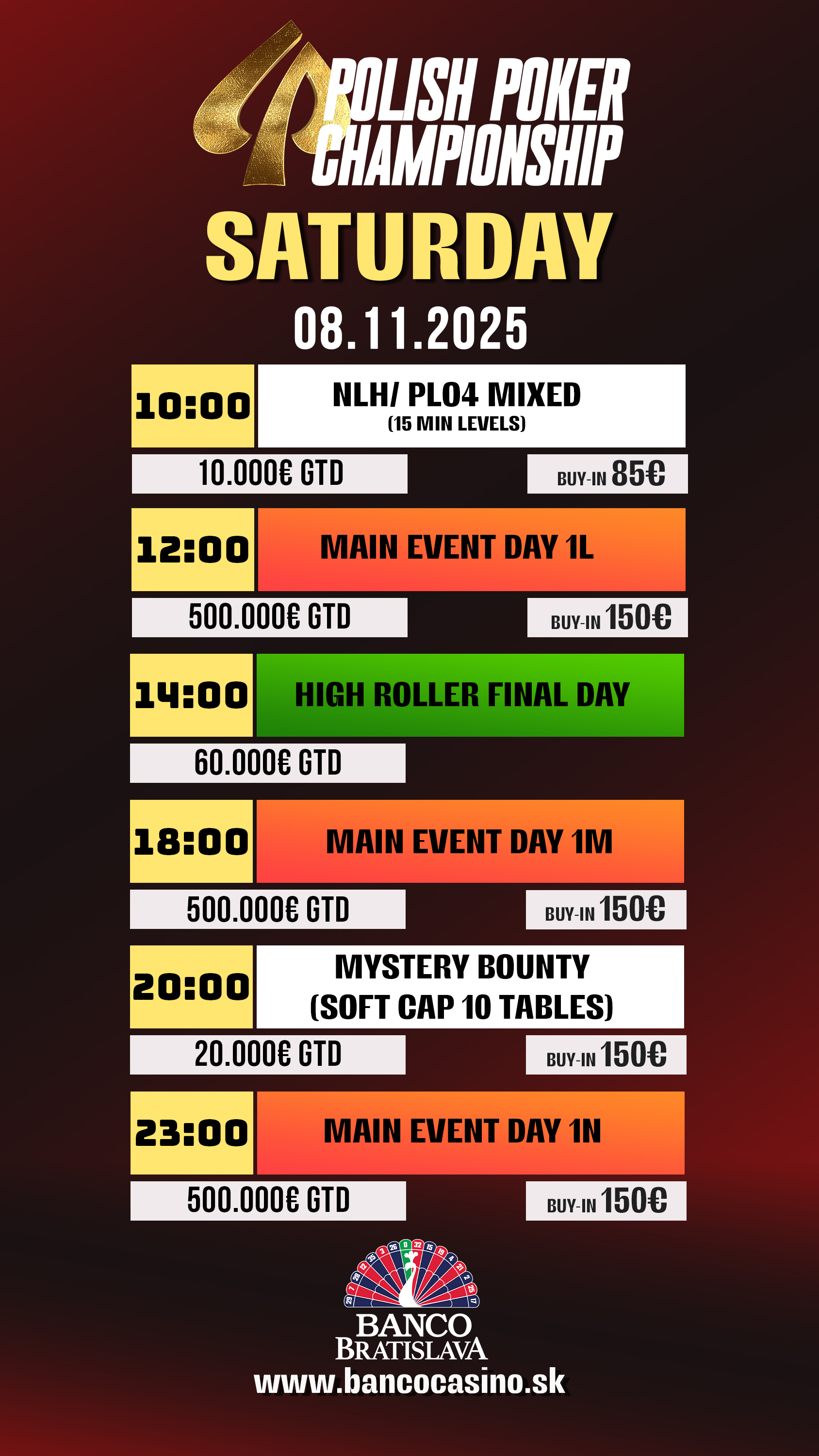 Polish Poker Championship Main Event v Banco Bratislava znova dobíja svoje vlastné rekordy! Hlavný turnaj už pred začiatkom včerajšieho flightu pokoril garanciu 500.000€ a v Banco sa skloňovalo slovo milión eur medzi prítomnými hráčmi. Dnes sú pred nami tri posledné možnosti na postup, v ktorých sa rozhodne o všetkom. Budeme pozorne sledovať či sa podarí zlomiť 1.000.000 eurovú hranicu a koľko hráčov sa prebojuje do Day 2.