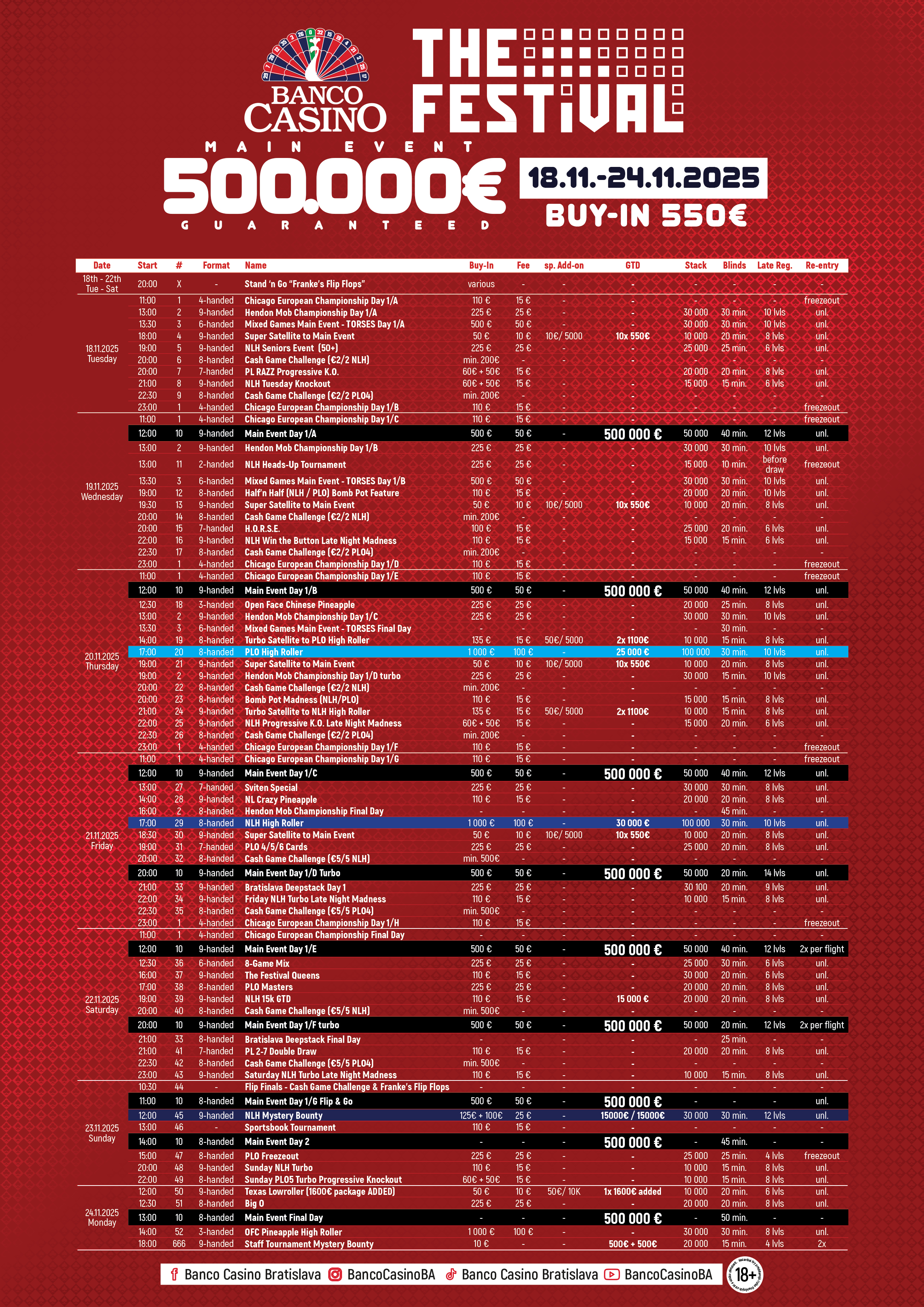 Po masívnom evente Polish Poker Championship príde na scénu milovaný, obľúbený THE FESTIVAL 2025 a s ním príde Main Event 500.000€ GTD za 550€ vstupné. Piaty ročník The Festival v Banco znova posunie limity tohto festivalu, keďže na účastníkov bude čakať 52 eventov. Pestrá paleta turnajov priláka ako vždy hráčov z celého sveta a my sa tešíme, že znova Bratislava bude epicentrom európskeho pokru!