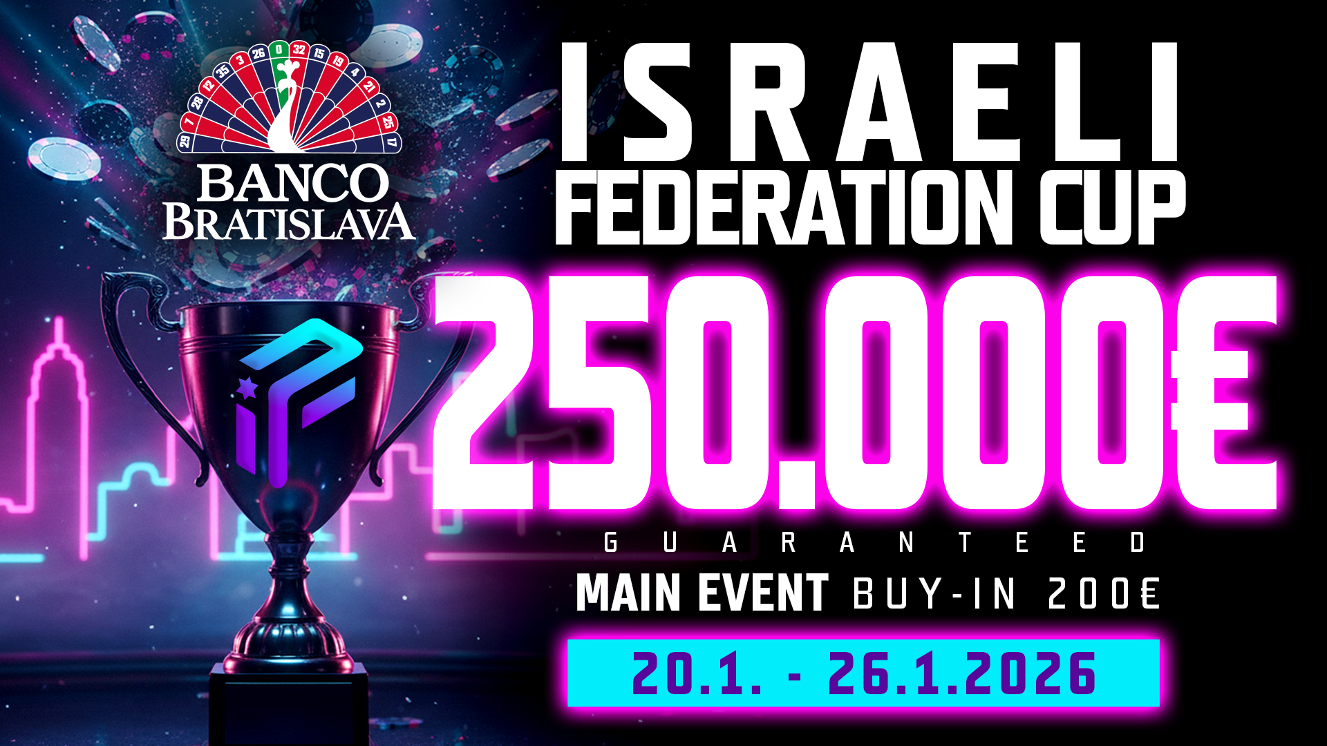 Banco prináša ďalšiu novinku na Slovensko, ktorá prinesie prestížnu značku Israeli Federation Cup pod záštitou najstaršej pokrovej organizácie IPC z Izraela. Očakáva sa viac ako 300 izraelských hráčov v dátume od 20.1. – 26.1.2026, kde Main Event bude garantovať 250.000€ a to len za 200 eurové vstupné!