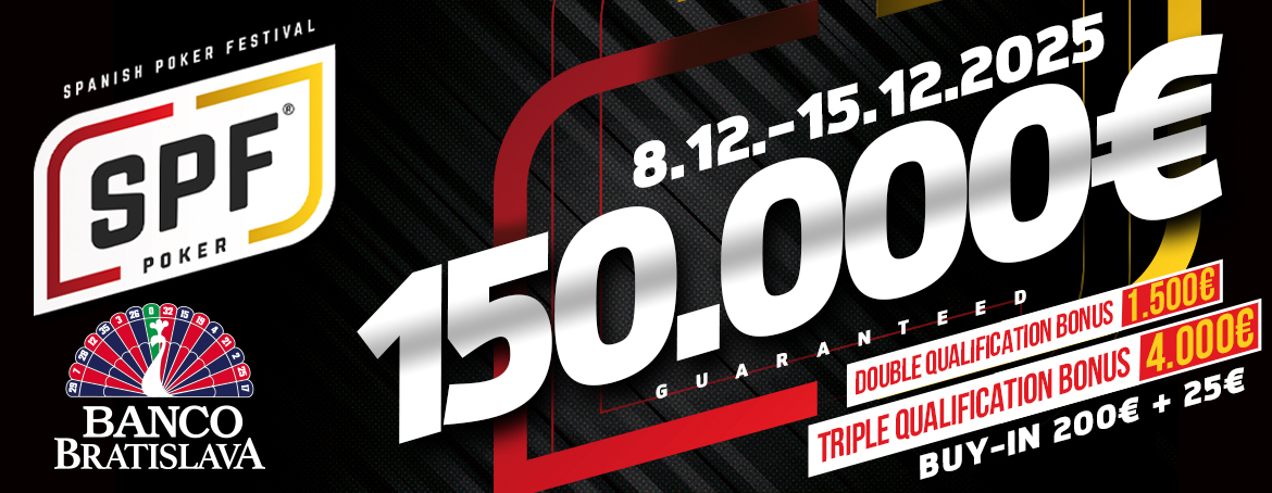 December prinesie Spanish Poker Festival s garantovaným Main Eventom 150.000€! Do Bratislavy zavíta viac ako 200 hráčov z pyrenejského polostrova a v hlavnom turnaji sa nebude bojovať iba o garantovaných 150.000€, ale aj o bonus za dvojitú či trojitú kvalifikáciu až do výšky 4.000€!