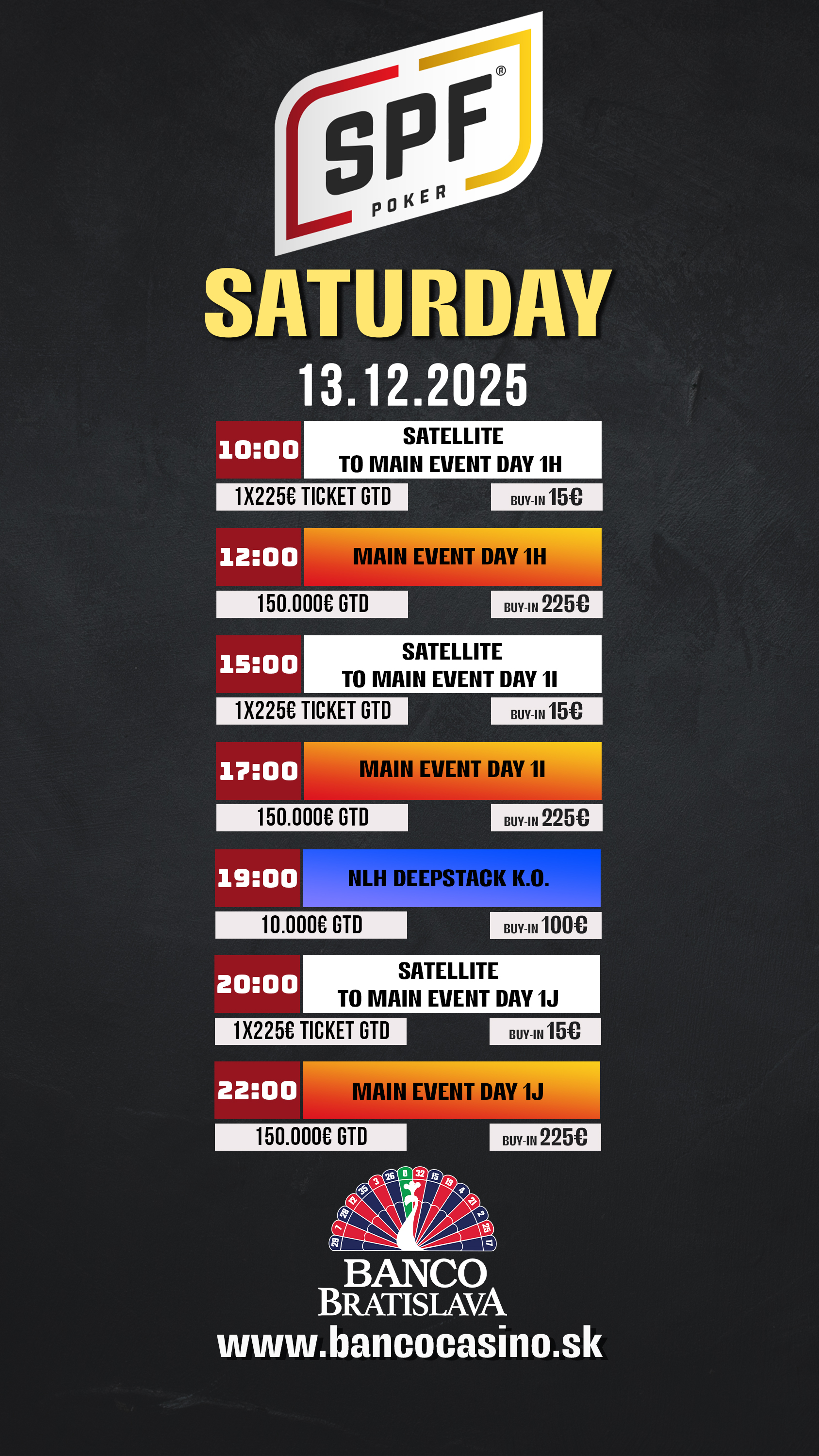 Hlavný turnaj Spanish Poker Festival konajúci sa v Banco Bratislava má pred sebou najsilnejší deň, keďže na programe sú tri možnosti na postup. V tomto momente iba 43 hráčov si zabezpečilo postup do Day 2 a to znamená, že zajtra čaká na hráčov minimálne 150.000 eur bank. Pred dnešným dňom chýba do naplnenia garancie 66.000€. Staňte sa španielskym šampiónom pre rok 2025!