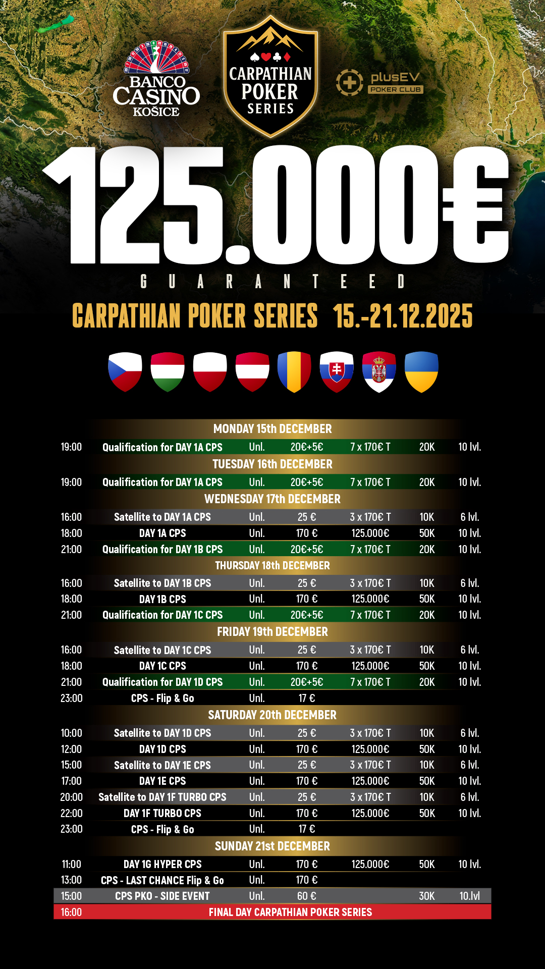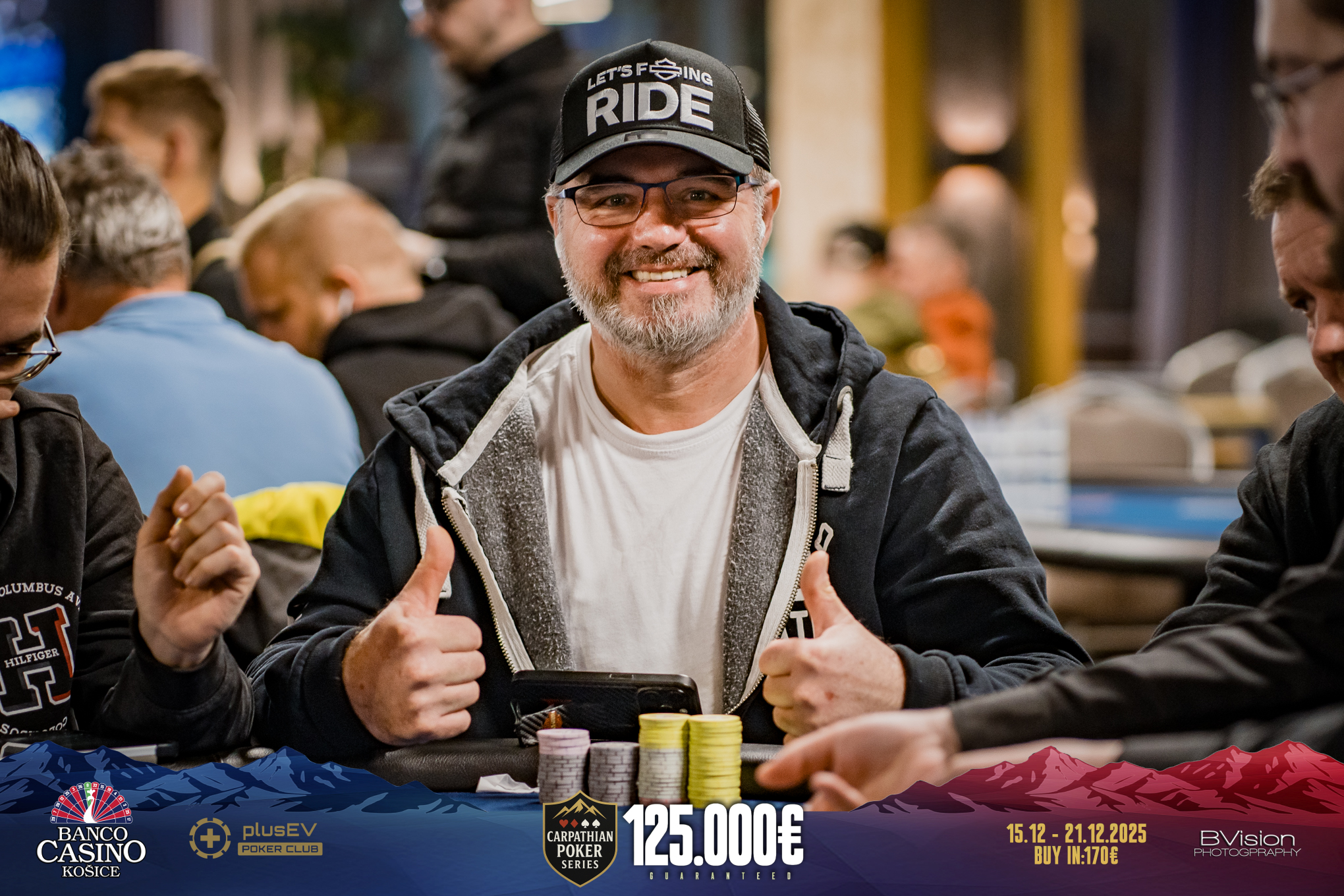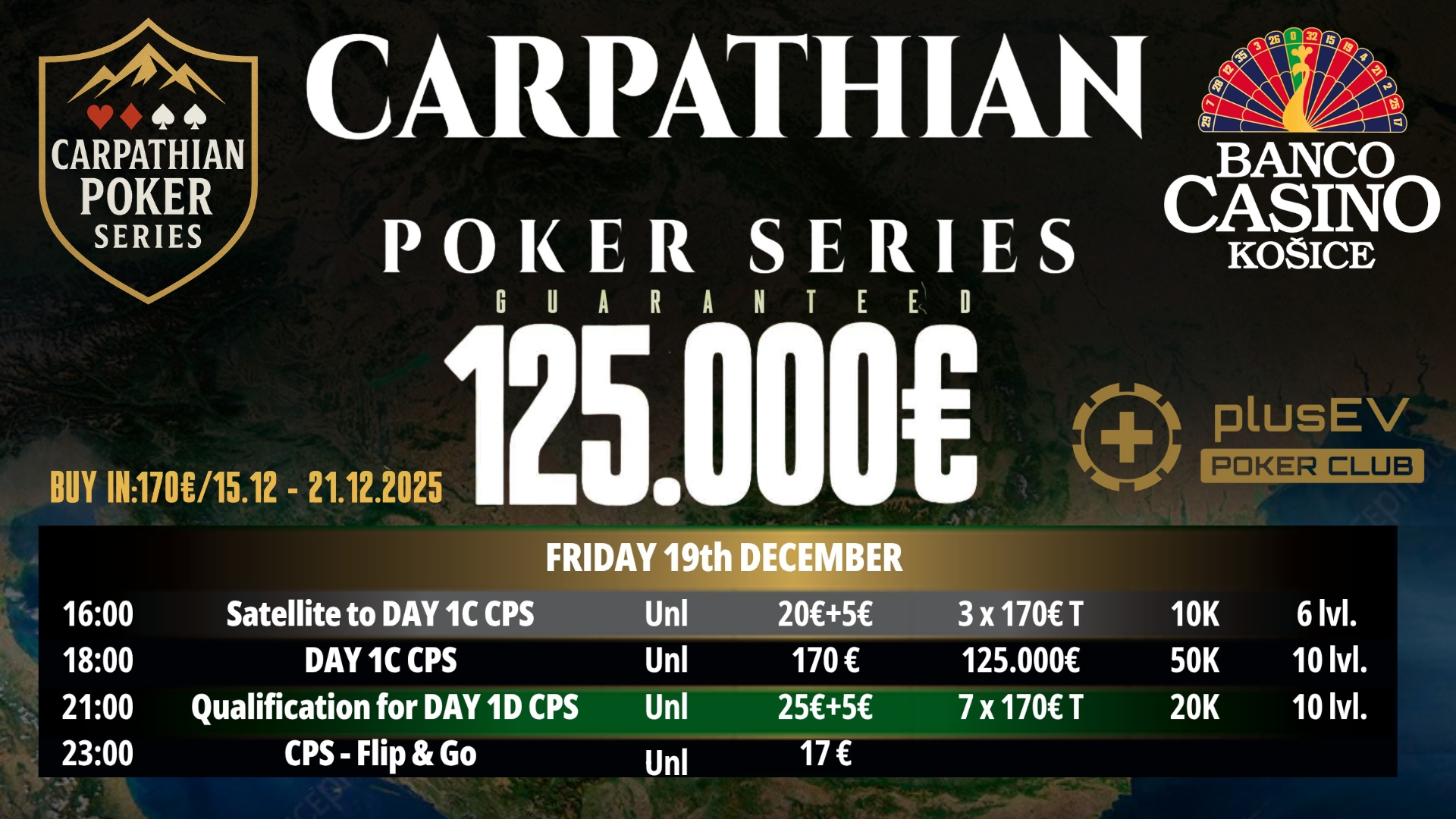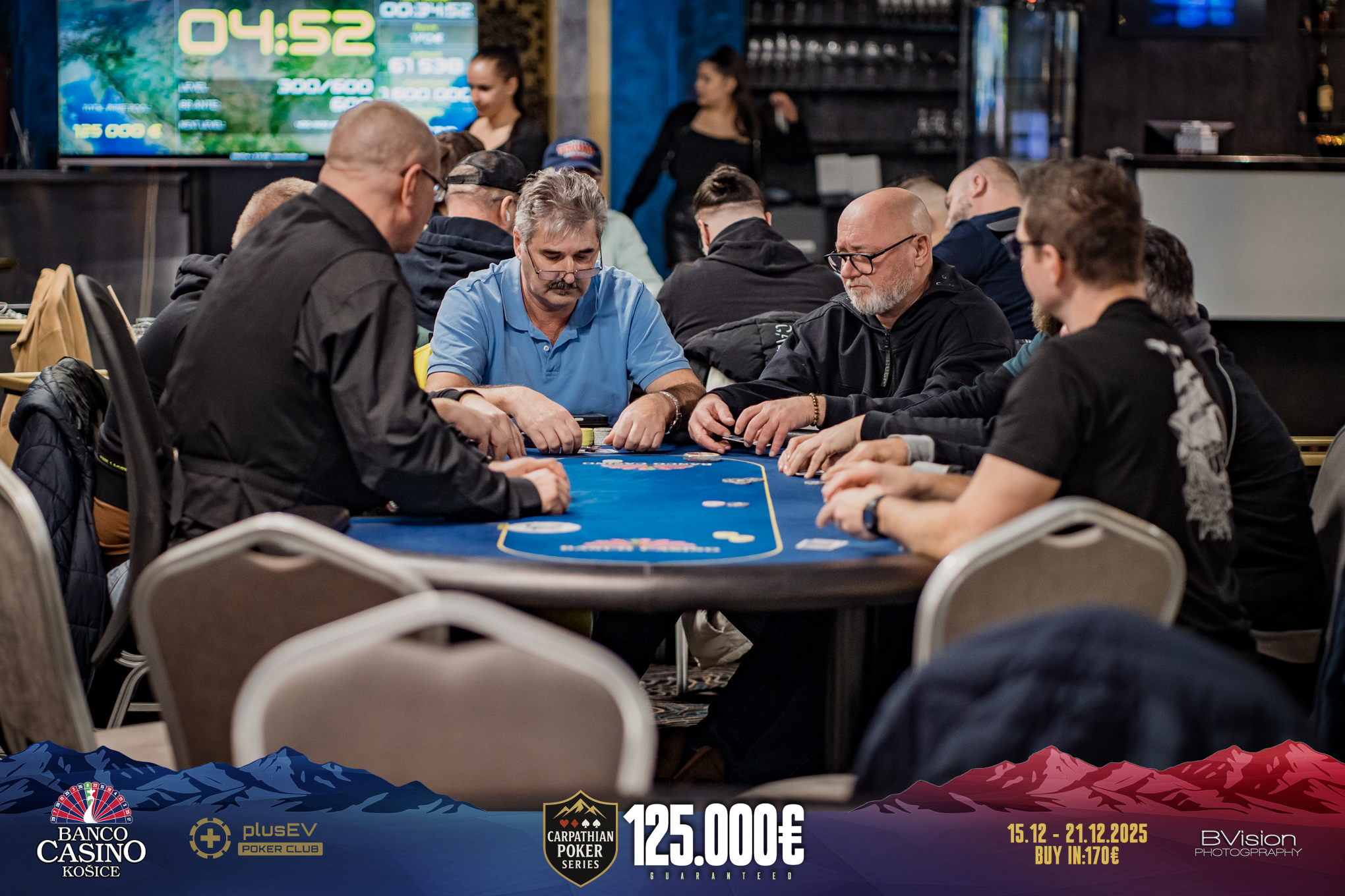 V Banco Casino Košice sa včera uskutočnil druhý štartovací flight DAY 1B veľkého pokrového podujatia Carpathian Poker Series s garanciou 125.000 €. Tento festival je hlavným lákadlom decembrovej ponuky košického kasína a počas aktuálneho týždňa prináša hráčom atraktívne cash games a samozrejme aj Main Event s garantovaným prizepoolom 125.000 €.