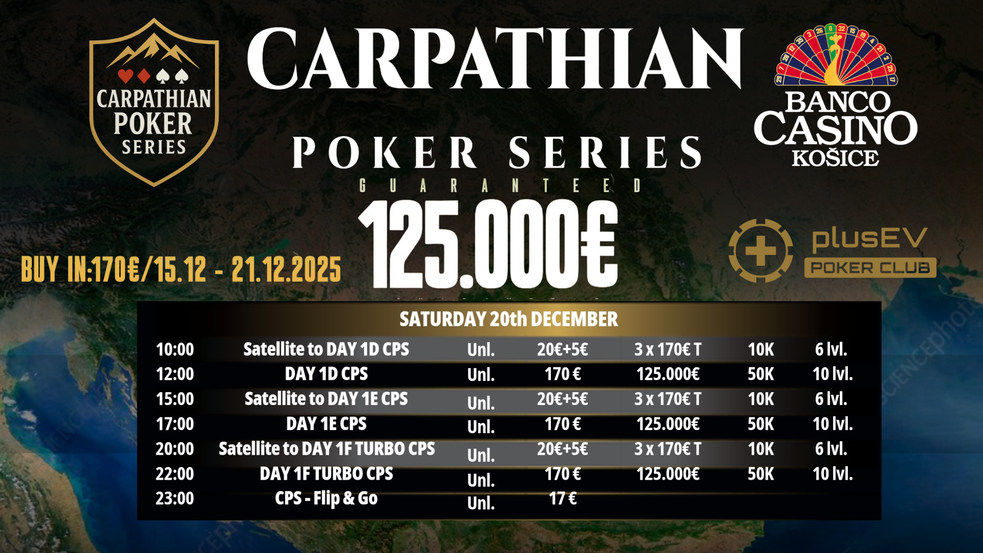 Turnajový festival Carpathian Poker Series 125.000€ GTD pokračuje ďalej. Kompletný program nájdete na webovej stránke Banco Casino Košice:.png)