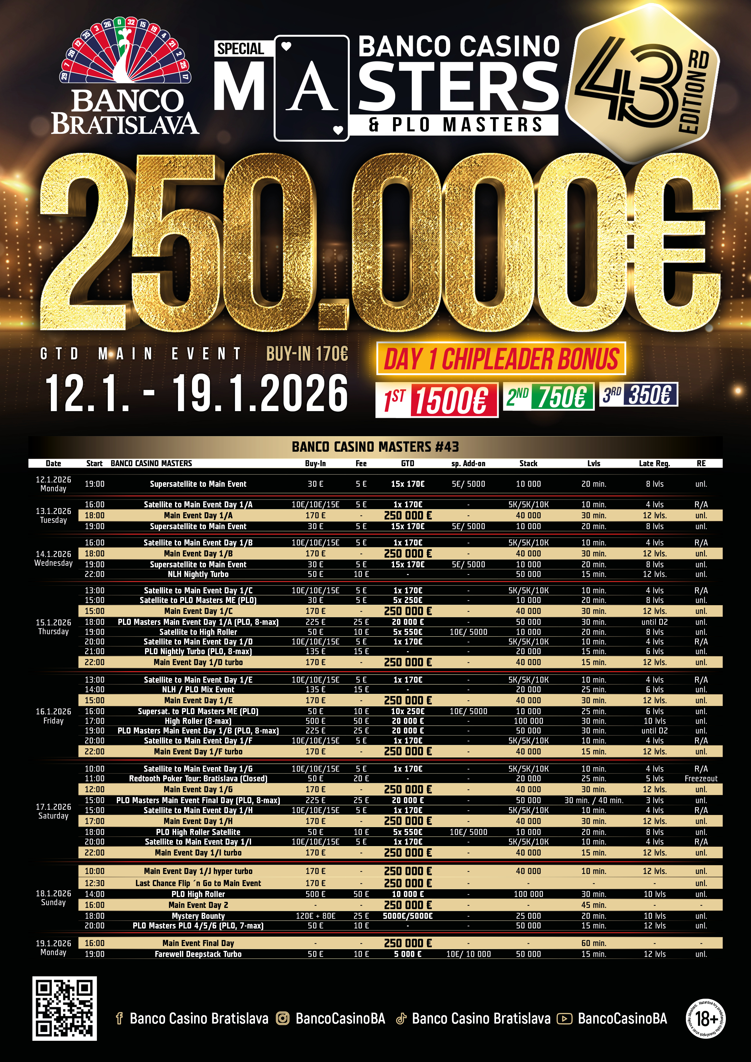 Eventová sezóna v Banco Bratislava začína vo veľkom štýle – 43. edícia Banco Casino Masters štartuje už v pondelok! Najväčší turnaj Main Event ponúkne fantastickú garanciu 250.000 € pri dostupnom buy-ine 170 €. Očakáva sa veľká účasť hráčov z rôznych kútov Európy, no jedna krajina bude mať viac ako 200 členné zastúpenie. Do Bratislavy mieri viac ako 200 hráčov z Veľkej Británie!