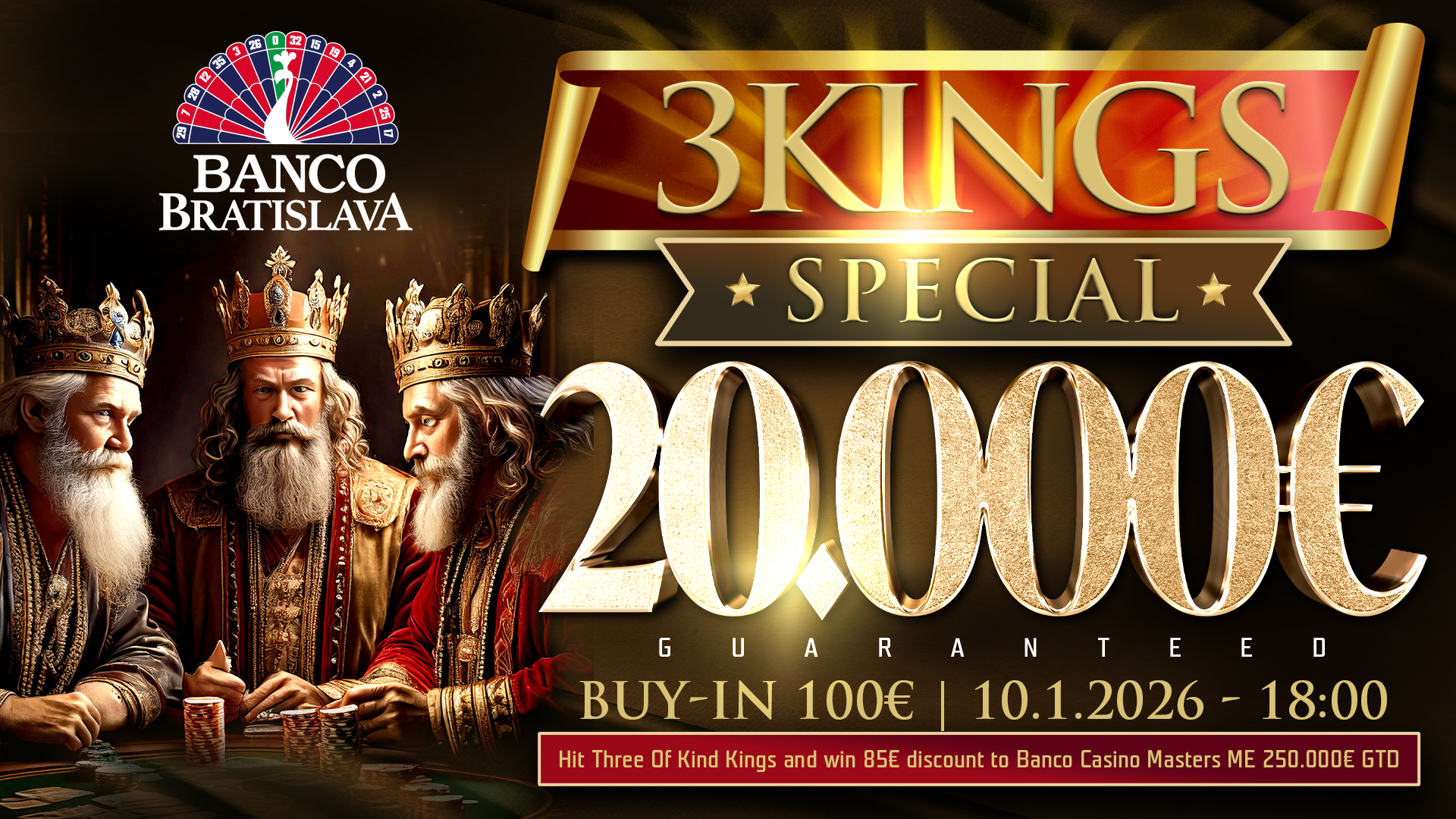 Pred Banco Casino Masters sa v Banco Bratislava môžete tešiť na piatkový Super Friday 10.000€ GTD a to len za 50 eurový buy-in. V sobotu do Banco zavítajú 3Králi a tí prinesú 20.000€ GTD za 100 eurové vstupné a spoločne s akciou vytvoria cez víkend skvelý pokrový zážitok. Aká akcia? Ak trafíte three of kind (set) z Kráľov, získate 85€ zľavu na nadchádzajúci Banco Casino Masters 250.000€ GTD!